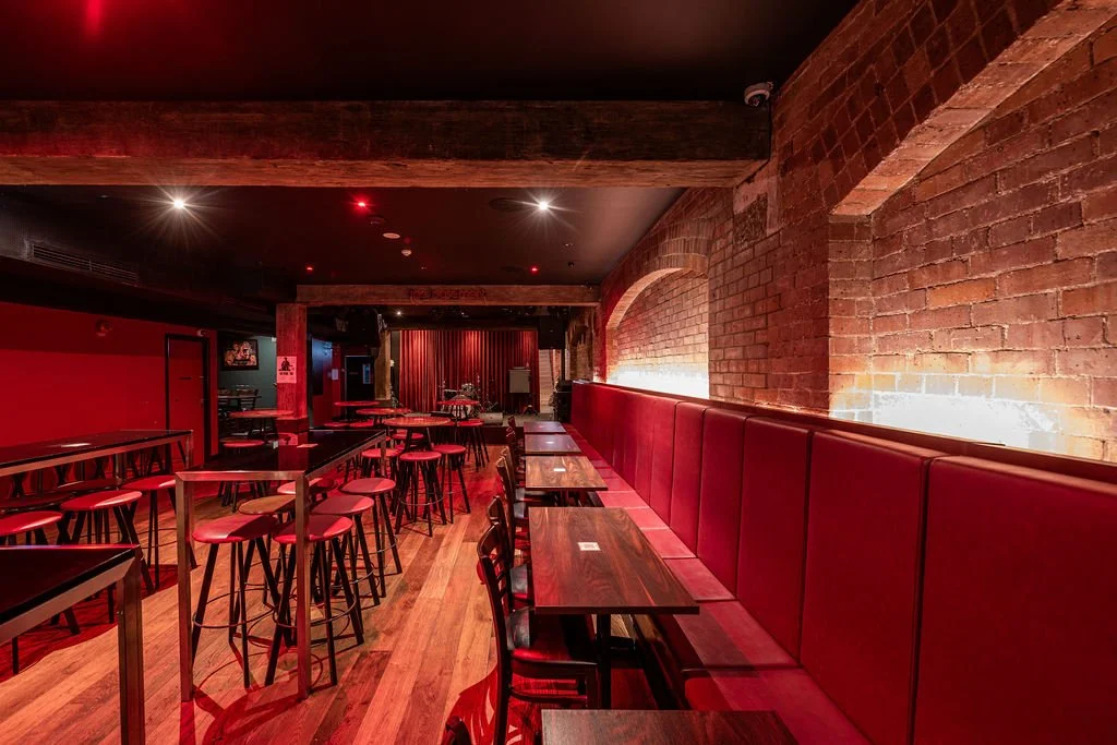 Immerse yourself in a moody, atmospheric underground space that blends vintage charm, with a contemporary edge. Striking red down lights and warm wooden accents create a cozy yet vibrant ambience.